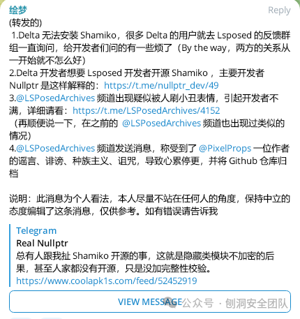 文章来源:刨洞安全团队近日因某游戏封了大批开挂用户导致多个作弊软件作者或用户联合迫使 LSPosed 开发组停更 LSPosed 及其相关项目。著名 Android 插件框架 LSPosed 宣布停止...
