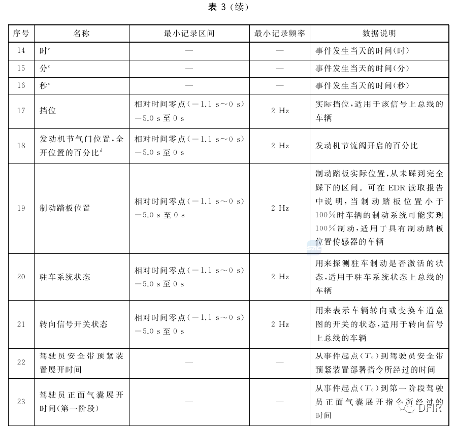 来源:DFIR汽车EDR一般记录车辆碰撞前后的数秒(5s左右)相关数据,包括车辆速度、发动机转速、油门和刹车位置、安全带使用情况、气囊打开情况等数据信息,取决于具体车型型号、制造年份、制造商等因素--...