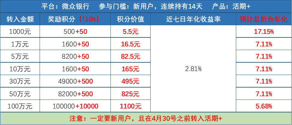最近微众银行搞了个活动,适合拿短期不用的闲钱参与一下,能薅到一些羊毛,给你们分享一下。1.活动参与很简单。1)新用户,扫描下面二维码开户2)买入微众银行的【活期+】,并连续持有14天活期+就是类似于支...