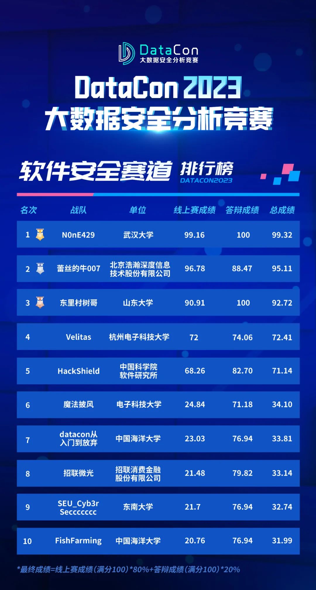 2023年11月16日,DataCon2023大数据安全分析竞赛线上赛圆满落幕。比赛历时十天,共设AI安全、软件安全、邮件安全、互联网威胁溯源和漏洞分析五大赛道。最终,各赛道前十名战队成功进入决赛答辩...