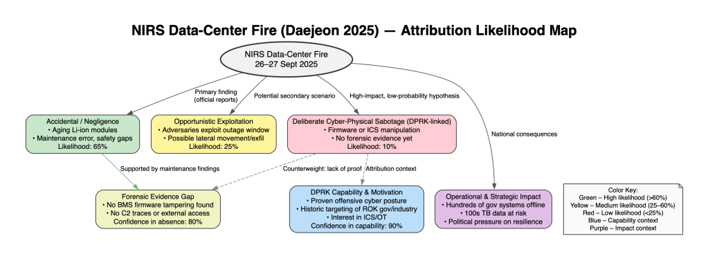 2025年9月26-27日, 韩国大田NIRS数据中心因LG电池爆炸起火, 导致数百个政府系统瘫痪数周. 警方逮捕四人涉疏忽. 事件引发对朝鲜网络攻击关联的猜测....