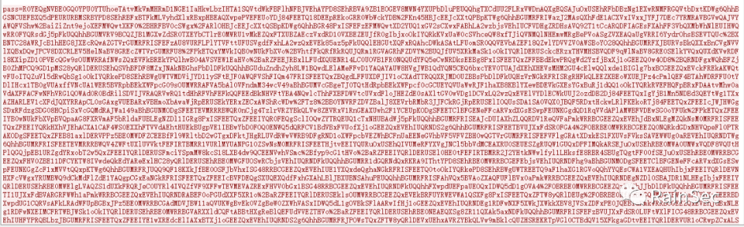这个shell脚本并无特别,一句话脚本上传即可。在流上与PHP_XOR_BASE64上的区别很明显,PHP_XOR_BASE64是key=加密,PHP_EVEAL_XOR_BASE64是pass=加密&key=加密,那么我们需要考虑的部分在于pass后面跟了什么内容由流可得: