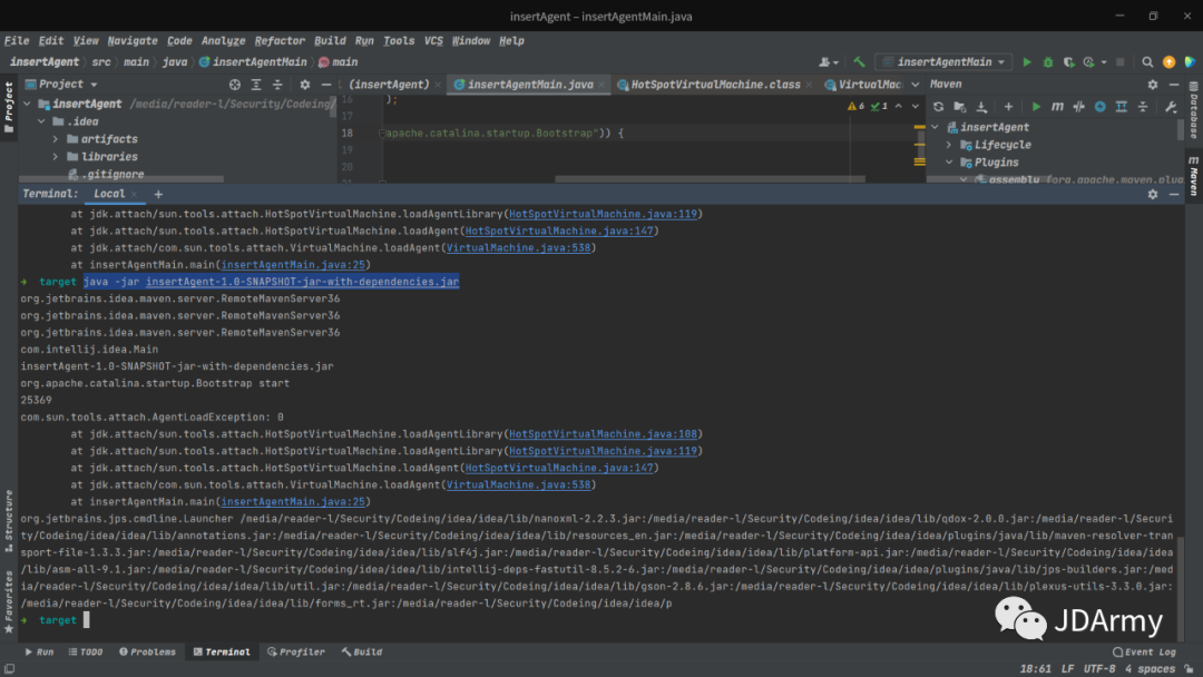 VirtualMachine vm = VirtualMachine.attach(v.id());loadAgent:在我们的JAVA程序附加到指定的JVM后,可以使用该方法向JVM加载一个agent,同时会给该agent传递一个Instrumentation实例,该实例可以用来在class加载前改变class的字节码,也可以在class加载后重新加载。在调用Instrumentation实例的方法时,这些方法会使用ClassFileTransformer接口中提供的方法进行处理。