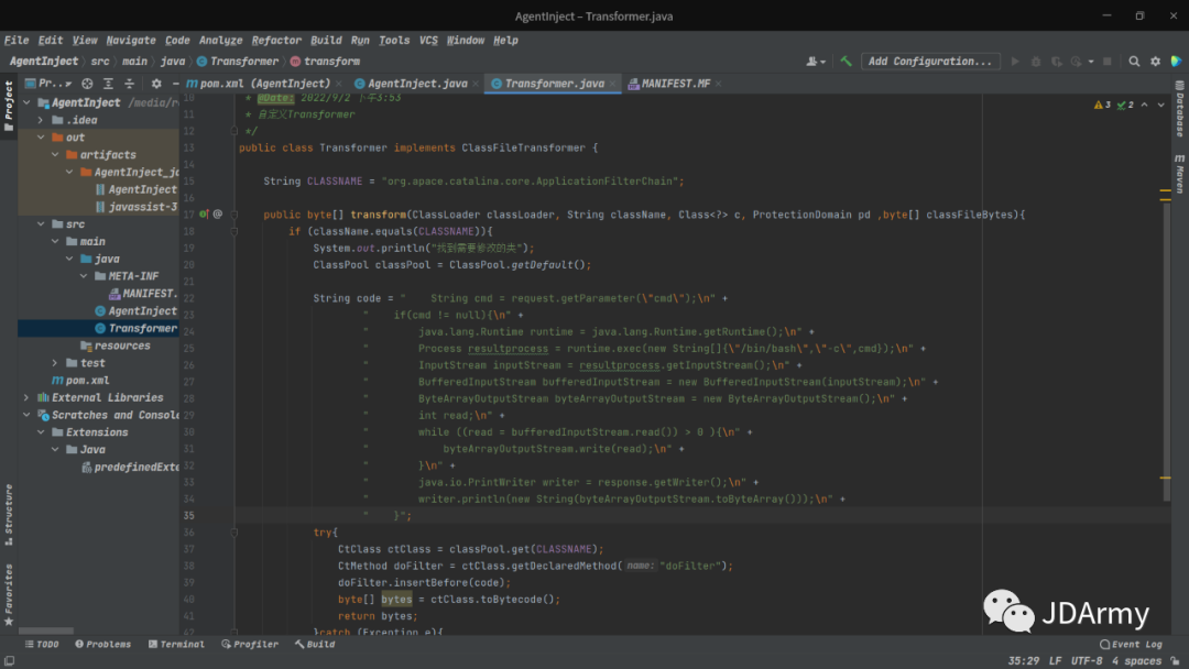 因此主要学习如何将一个agent加载进jvm里、学习agent在被加载后需要实施的行为(将恶意代码动态写进类里)。