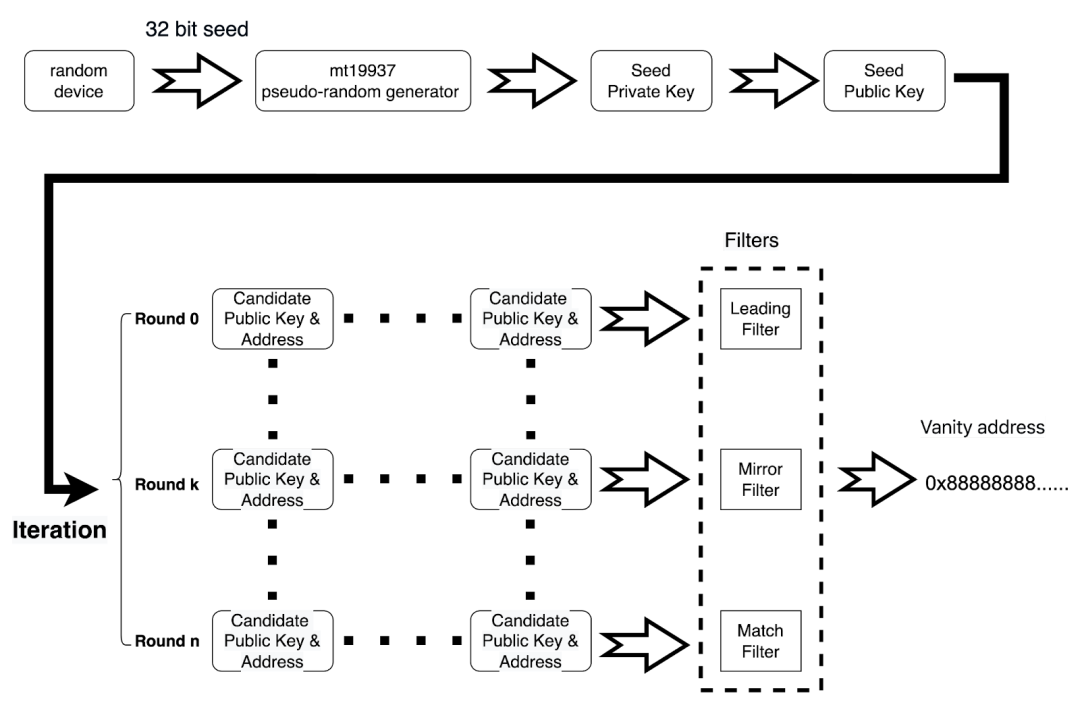 调用 OpenCL 并行计算平台,调用基于种子公钥(Seed Public Key) 的多轮迭代算法,计算大量的候选公钥(Candidate Public Key) 和 eth 地址(Address)。