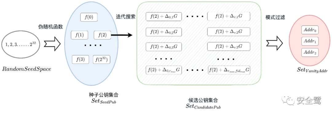 基于每个备选公钥,计算 eth 地址。随后使用模式过滤器,筛出靓号地址。这里,我们把靓号地址所构成的集合记为