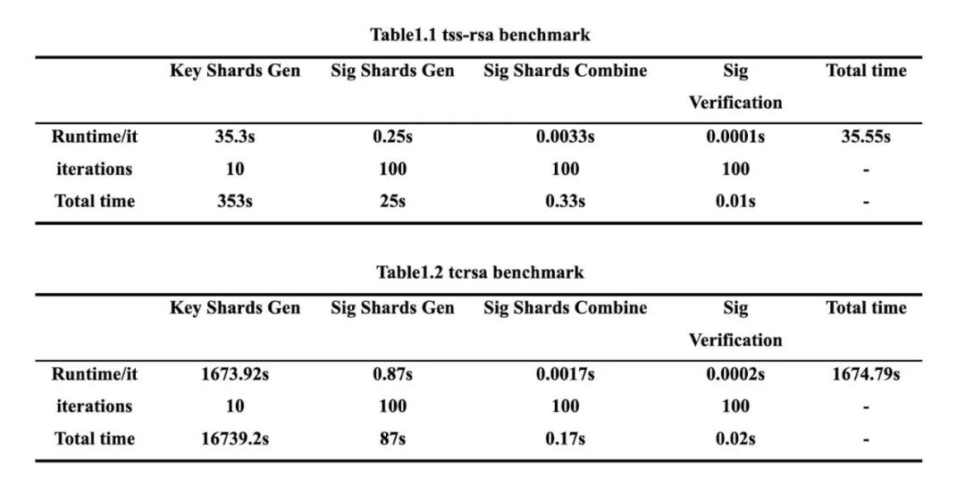 everPay 当前生成私钥分片,使用基于 Golang 实现的开源算法库 TCRSA,整个过程需要持续 30 分钟左右的时间,而替换为 TSS-RSA 算法库后,生成分片的时间直接被缩短至平均 30s 左右。如下图所示:TSS-RSA 执行一轮完整的签名生成和验证需要 35.55s,而 TCRSA 执行完一轮 完整的签名生成和验证需要 1674.79s,后者所需时间约是前者的 47 倍。