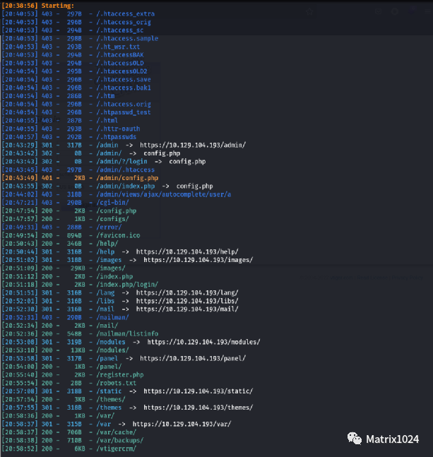 使用Diresearch对https://10.129.104.193/进行目录扫描,发现部分敏感信息。