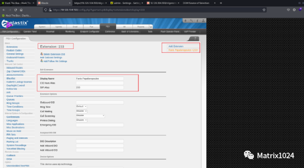 使用admin/jEhdIekWmdjE登录https://10.129.104.193/,查看配置信息,在https://10.129.104.193/config.php?type=setup&display=extensions&extdisplay=233获取到extension值。