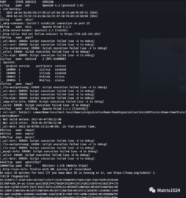 使用Nmap对靶场地址进行端口嗅探,靶场对外开放22、25、80、110、111、143、443、993、995、3306、4445、10000端口,操作系统类型为Linux。