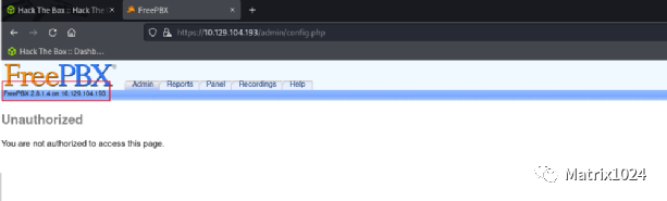 在https://10.129.104.193/admin/config.php页面发现登录口,退出登录操作时跳转至401未认证页面,在左上角可以看到FreePBX的版本为2.8.1.4。