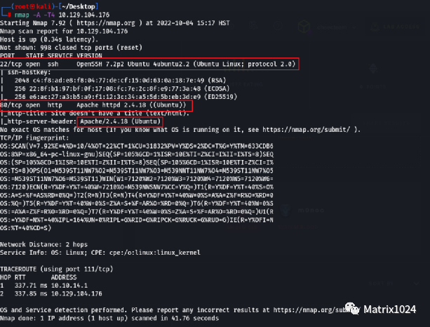 使用Nmap对靶机地址进行端口嗅探,发现对外开放22、80端口,操作系统为Linux。