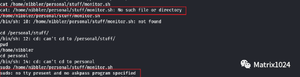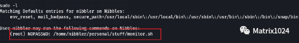 执行sudo -l,发现/home/nibbler/personal/stuff/monitor.sh具备root执行权限。