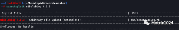 使用Searchsploit对”nibbleblog 4.0.3“进行漏洞发现,发现存在文件上传漏洞,且为MSF漏洞利用脚本。