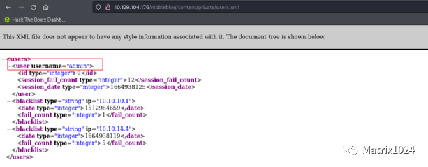 在http://10.129.104.176/nibbleblog/content/private/users.xml页面发现admin账户。