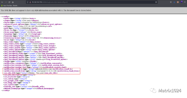 在http://10.129.104.176/nibbleblog/content/private/config.xml页面发现[email protected]邮箱地址。与此同时,还发现大量.bit后缀的类似源代码的文件。