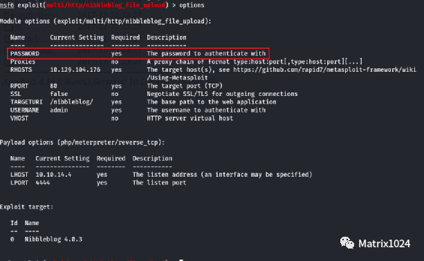 尝试使用exploit/multi/http/nibbleblog_file_upload模块对其利用,发现需要PASSWORD信息。