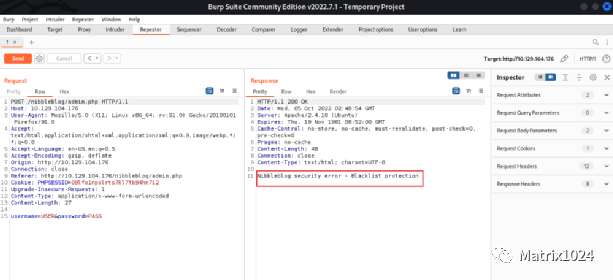 尝试使用Burpsuite对登录页面进行爆破,发现爆破动作被发现且阻止(爆破动作忘记截图,以下重放动作同样可以证明),无法通过爆破手段获取admin的口令信息。
