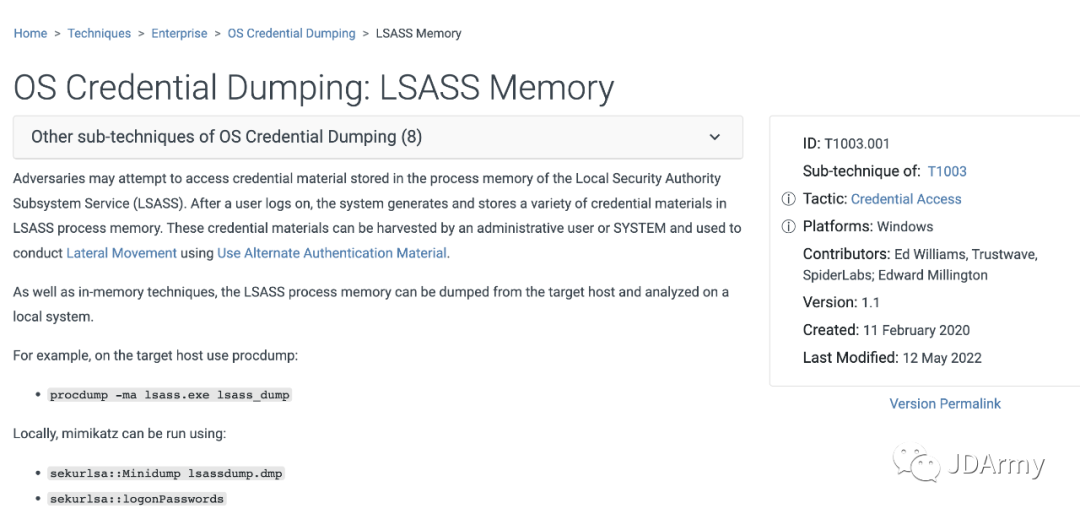 lsass是windows中处理本地安全和登录策略的重要进程,几乎所有的windows身份认证程序都离不开lsass进程。因此在lsass的内存中会保存用户相关的凭证。它是windows主机中认证的重要组成部分,因此获取lsass内存也是MITRE ATT&CK框架中Credential Access战术下的重要技术点。