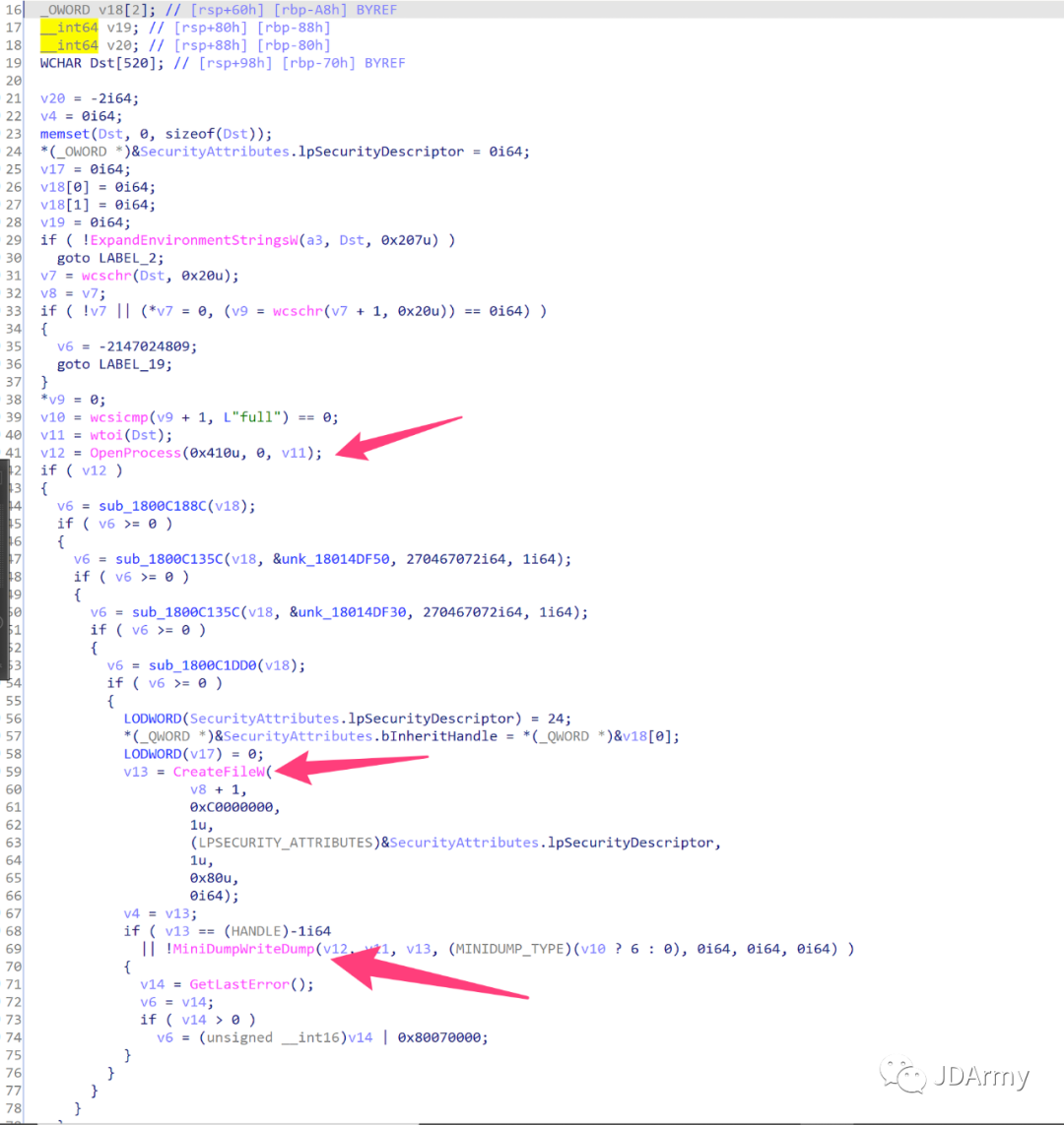 MiniDumpW通过OpenProcess+CreateFileW+MiniDumpWriteDump函数来dump内存。