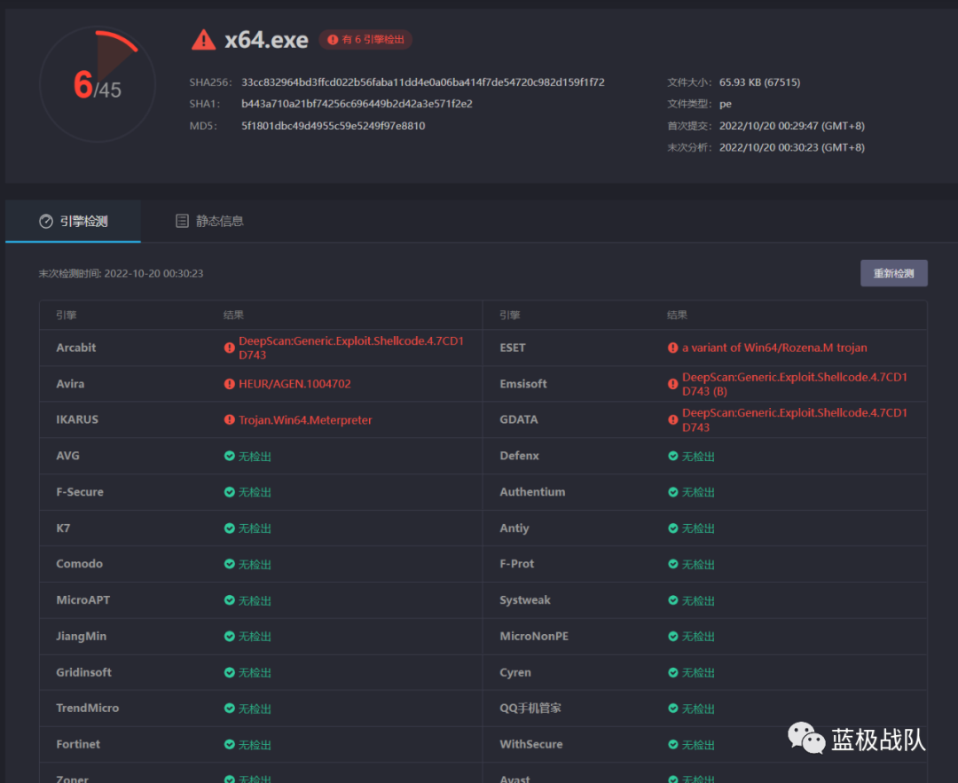 至此,我们的shellcode算是成功的运行了,看看免杀情况怎么样。