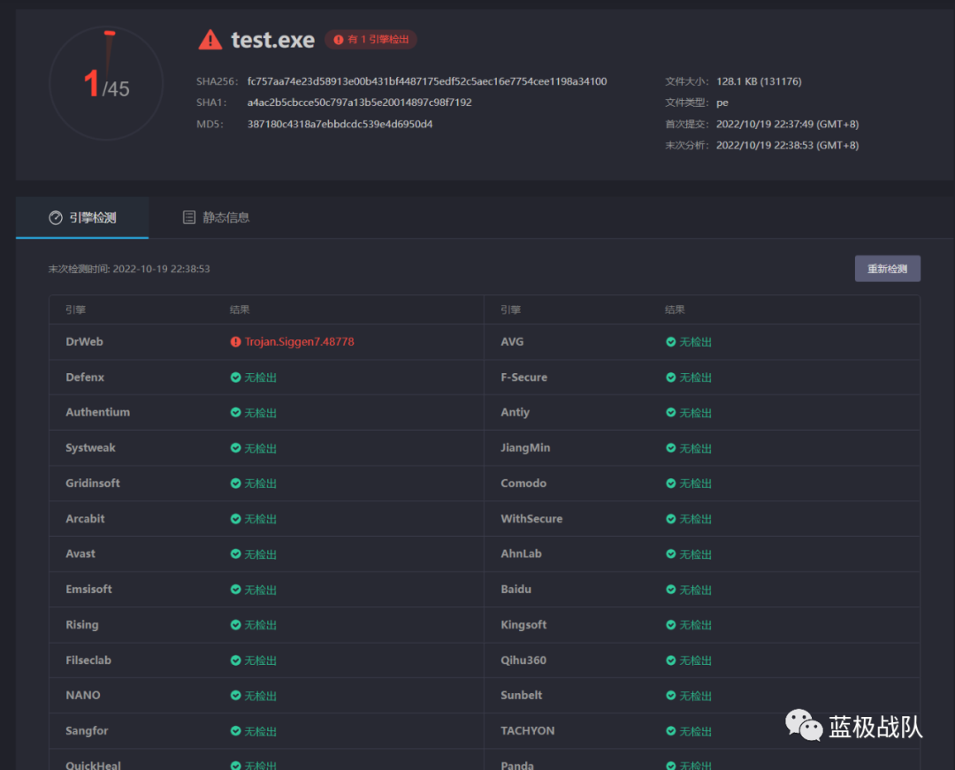 为什么很多自己写的程序比较容易过安全软件的扫描,很大一部分原因是它没有我的特征,如果是发布过的并且有大量人使用,那么特征一定是被记录得明明白白。特征包含的就太广了,比如最浅显的hash值,更多的是程序内的某一段固定的二进制数据等等。