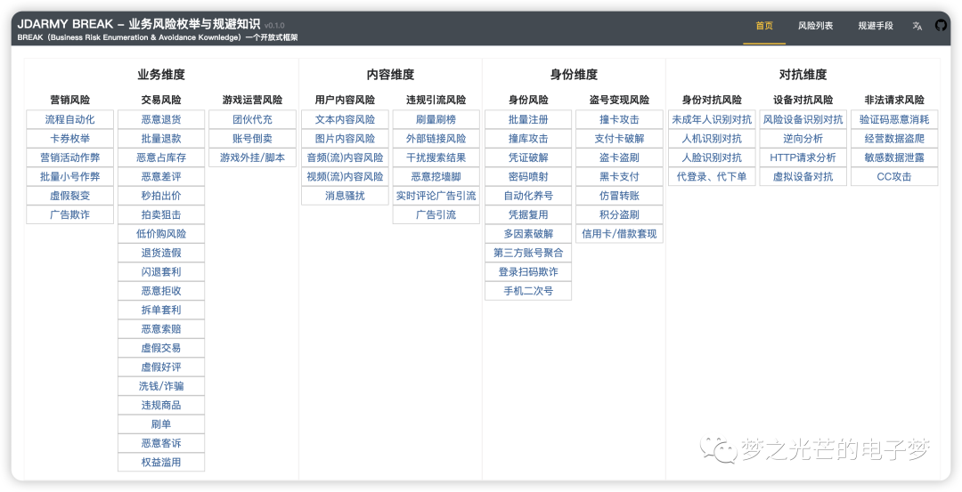 BREAK 是英文“Business Risk Enumeration & Avoidance Kownledge”的缩写,是一个开放式“业务风险枚举与规避知识”框架。该框架通过对各种业务风险进行分类、介绍与枚举,为使用者提供了一个完整的业务风险全景图,并对业务规避风险、提升能力提供了规避知识。