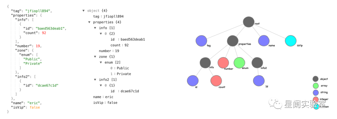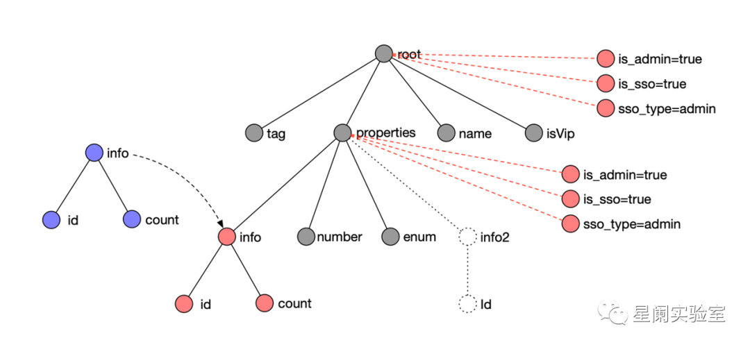 以下面这个JSON请求包为例,解析算法会将其转换为右边所示的树结构,无论其嵌套的层次有多深,解析算法会将其中的所有键值对都解析为一个树结构。然后可以对树中的叶子节点进行变异,也可以对树的整体结构上进行变异。在树上进行变异之后,将树按照原始的数据格式再还原回去,填充到请求报文中,形成变异的请求报文之后再发送出去。