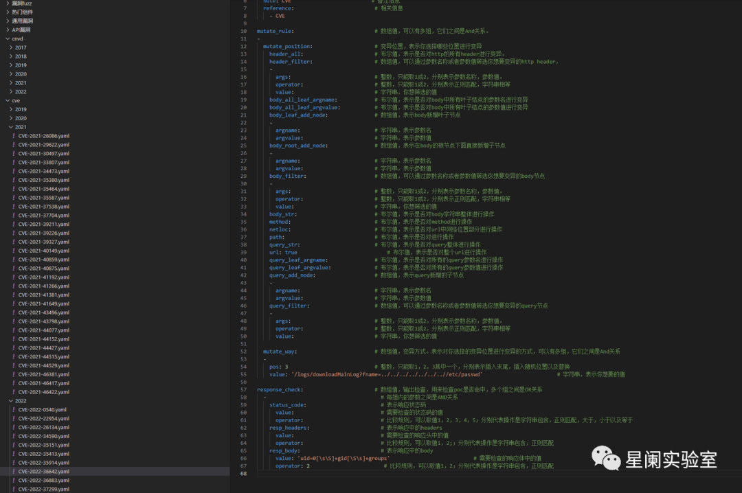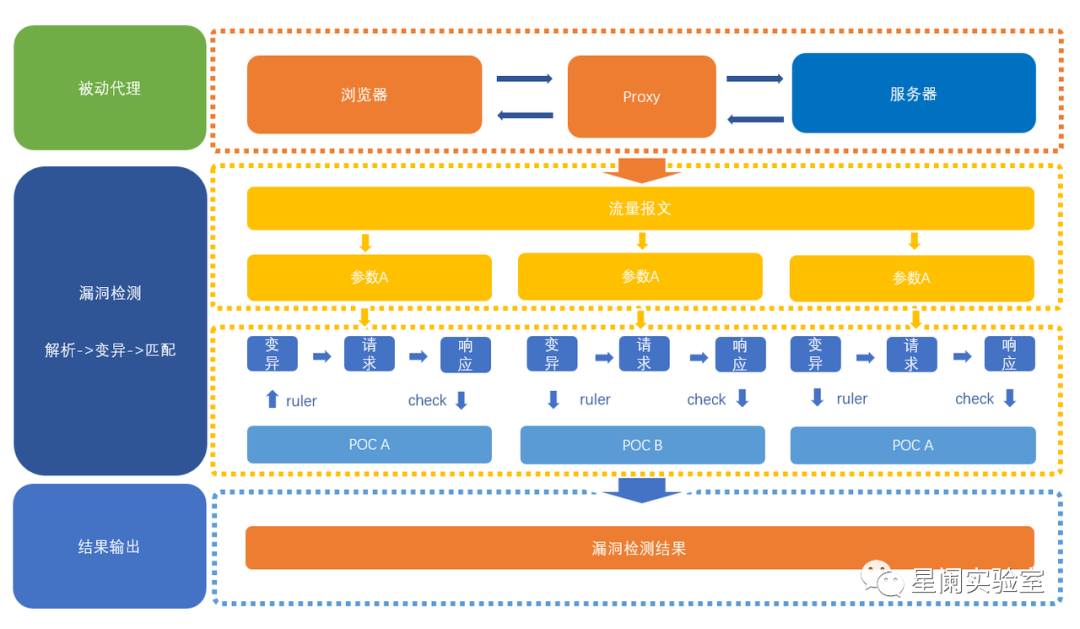 漏洞检测部分,采用解析算法,深度解析流量请求中的参数,通过POC中设定的注入点和变异方式生成测试请求,发送请求之后,再通过POC中的验证规则进行成功性判断,最终输出Fuzz结果。