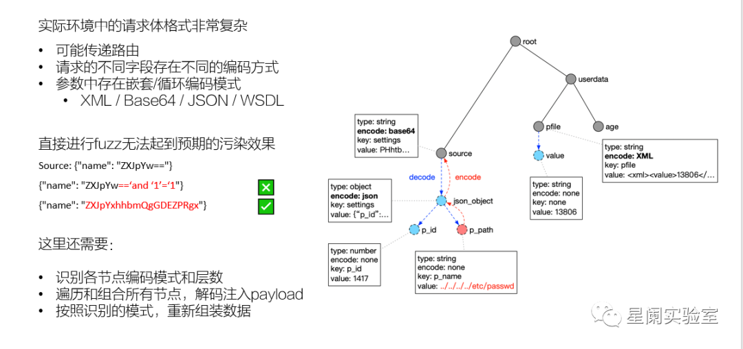 随着Web应用复杂度的提升与API接口的广泛使用,在HTTP应用漏洞Fuzz过程中,传统的「Form表单明文传参的模式」已经逐渐变为「复杂、嵌套编码的参数传递」。在此情况下,直接对参数内容进行注入或替换,无法深入底层的漏洞触发点。