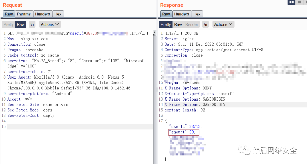首先,我们要让系统觉得我们是有钱有实力的,第一步得让 确认兑换 按钮可以点击,在点进蓝牙音箱页面的同时,系统会发起一个余额查询请求,然后根据返回结果判断我们是否有足够的财力去兑换这个蓝牙音箱,很显然!我们是没有那个财力的,那怎么办,财力不够技术来凑呗,这里我发现返回包里面有amout字段,发现和我的积分总余额能对应上,如图