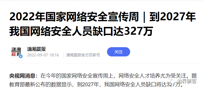 这个数据一出来我就笑了,同时开始忧虑了。作为安全行业同龄段领跑的那批人(恬不知耻的自我感觉良好),我都在忧虑2027年会不会失业了,官方竟然报道2027年有这么大的缺口!!!