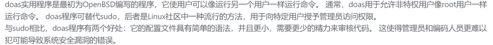 doas是BSD系列系统下的权限管理工具,类似于Debian系列下的sudo命令,简单来说,Doas是一个与Sudo具有相同功能的软件。