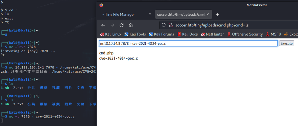 拿到当前权限为www-data,需进行提权,通过nc传输提权的POC文件,但上传后不久文件被清除。