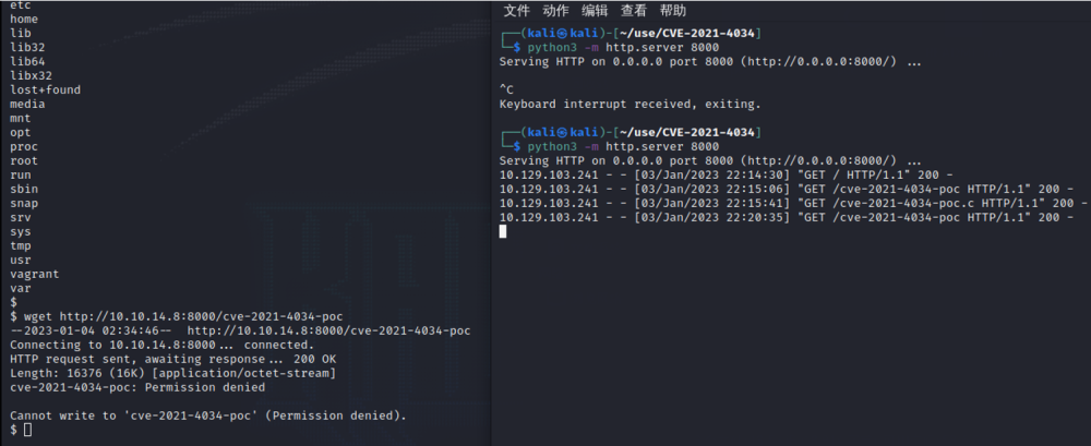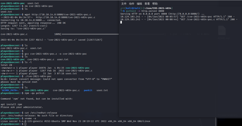 通过wget下载提权POC进行利用,编译cve-2021-4034,执行POC发现执行失败,无法提权。
