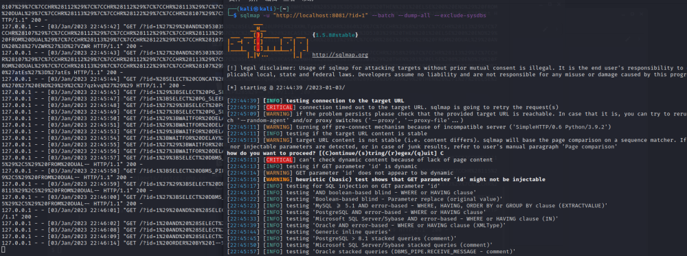 使用sqlmap对地址(http://localhost:8081/?id=1)进行SQL注入,我们无法针对websocket协议本身进行注入,所以使用的中转注入,原理为通过websocket客户端包装sqlmap注入的流量,然后通过客户端与服务端的交互进行注入。