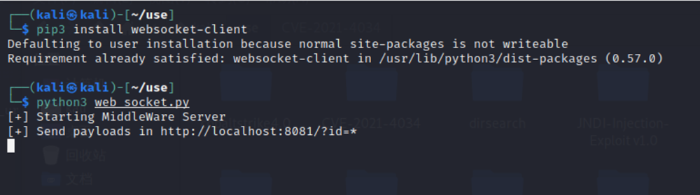 接着安装websocket模块,我的攻击机中已有该模块,然后直接执行我们保存的py文件,将我们的攻击机作为客户端向服务端发起数据请求。