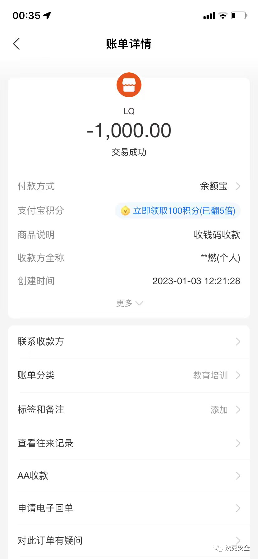 支付宝转账截图: