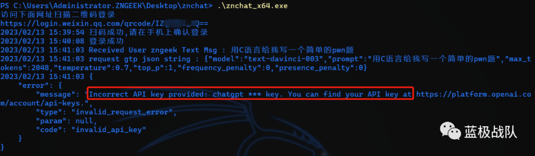 如果你的chatgpt key不正确,会报错。