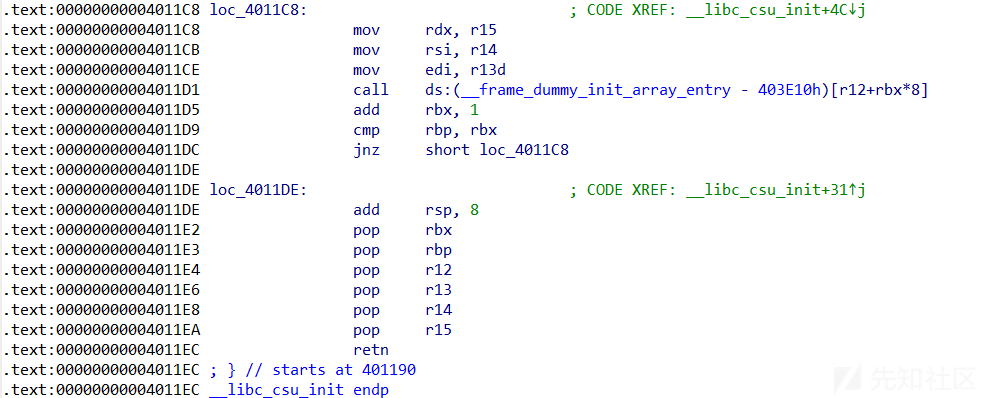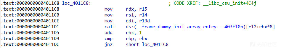 .text:00000000004011C8 loc_4011C8: ; CODE XREF: __libc_csu_init+4C↓j