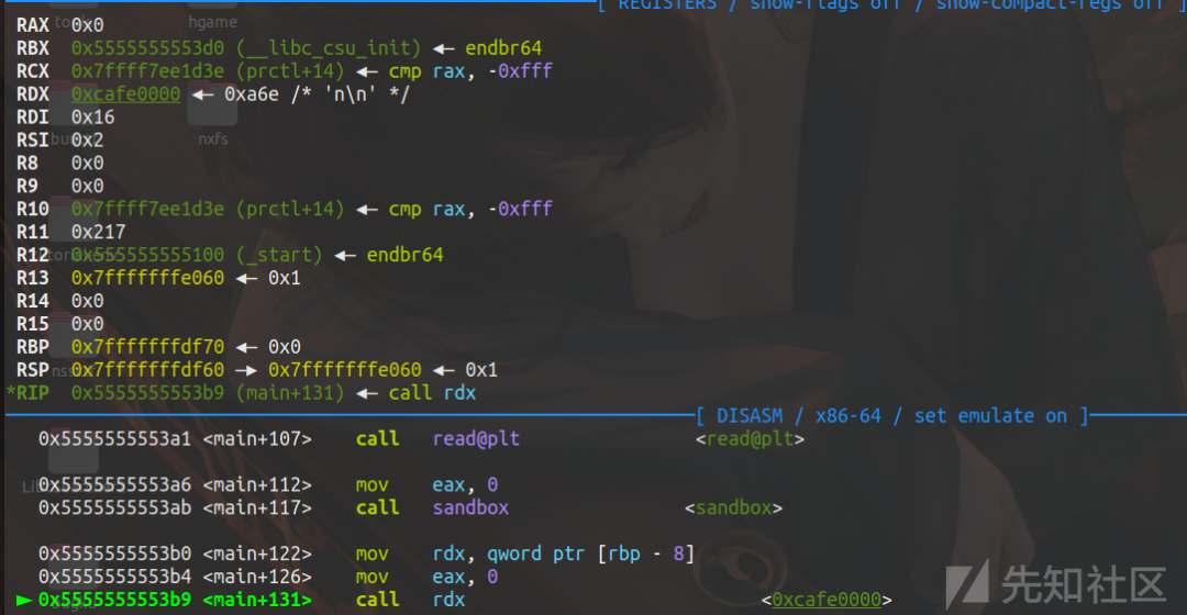 RIP 0x5555555553b9 (main+131) ◂— call rdx