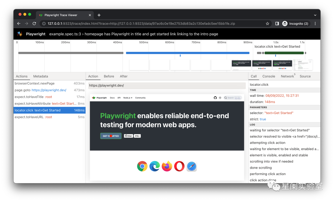 Playwright 追踪查看器是一个 GUI 工具,它使你可以探查测试中记录的 Playwright 追踪,可以在测试的每个操作中来回移动,可视化地查看每个操作期间正在发生什么。