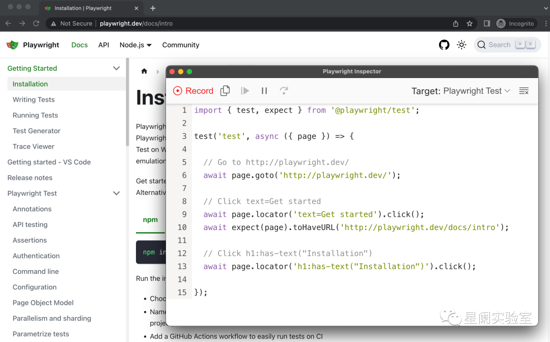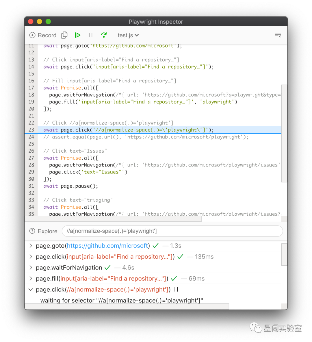 Playwright 检查器:检查页面,生成选择器,逐步完成测试执行,查看单击点,探索执行日志。